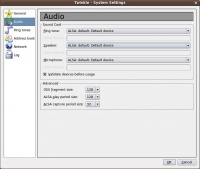 Selanjutnya twinkle akan menawarkan konfigurasi audio. Kita dapat mengubah panjang paket suara terutama dibutuhkan jika jaringan tidak terlalu baik. Parameter audio yang dapat diubah seperti,