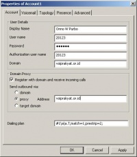 In the account tab, you have to fill in your username, authorization user name, which is the phone number given by the provider, the password obtained from VoIP Rakyat or any other SIP providers; the proxy address, which is voiprakyat.or.id, the address of VoIP Rakyat. Other information you also have to fill are domain, which is voiprakyat.or.id, and Display name, any name you want to enter. This functions as a Caller ID in a telecom network.