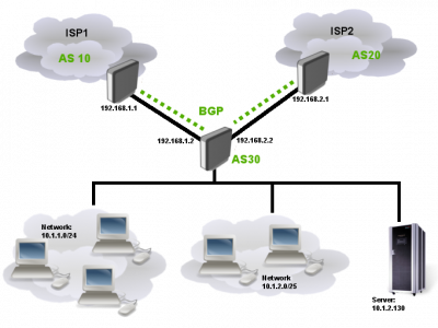 IP 192.168.1.2/24 - menuju ISP1 IP 192.168.2.2/24 - menuju ISP2 AS 30 IP 10.1.1.0/24 IP 10.1.2.0/24