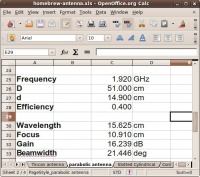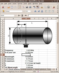 Tampilan perhitungan menggunakan spread sheet yang saya buat dan dapat anda ambil di situs DIKLAT ORARI http://125.160.17.21/speedyorari/view.php?file=orari-diklat/teknik/2.4ghz/buku-wifi/homebrew-antenna.xls tampak pada gambar berikut.